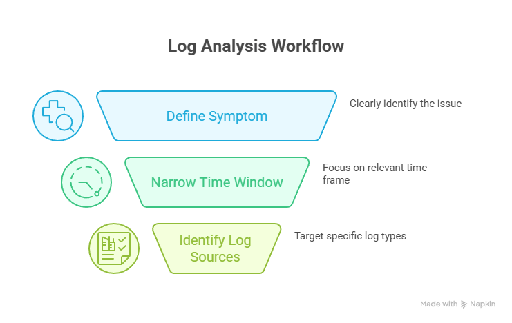 This is the stage where log analysis stops being reactive and turns into a deliberate, professional workflow. Instead of jumping between files and hoping an obvious error appears, experienced sysadmins apply structured reasoning to reduce noise and expose the real cause of failure. The same is given below.